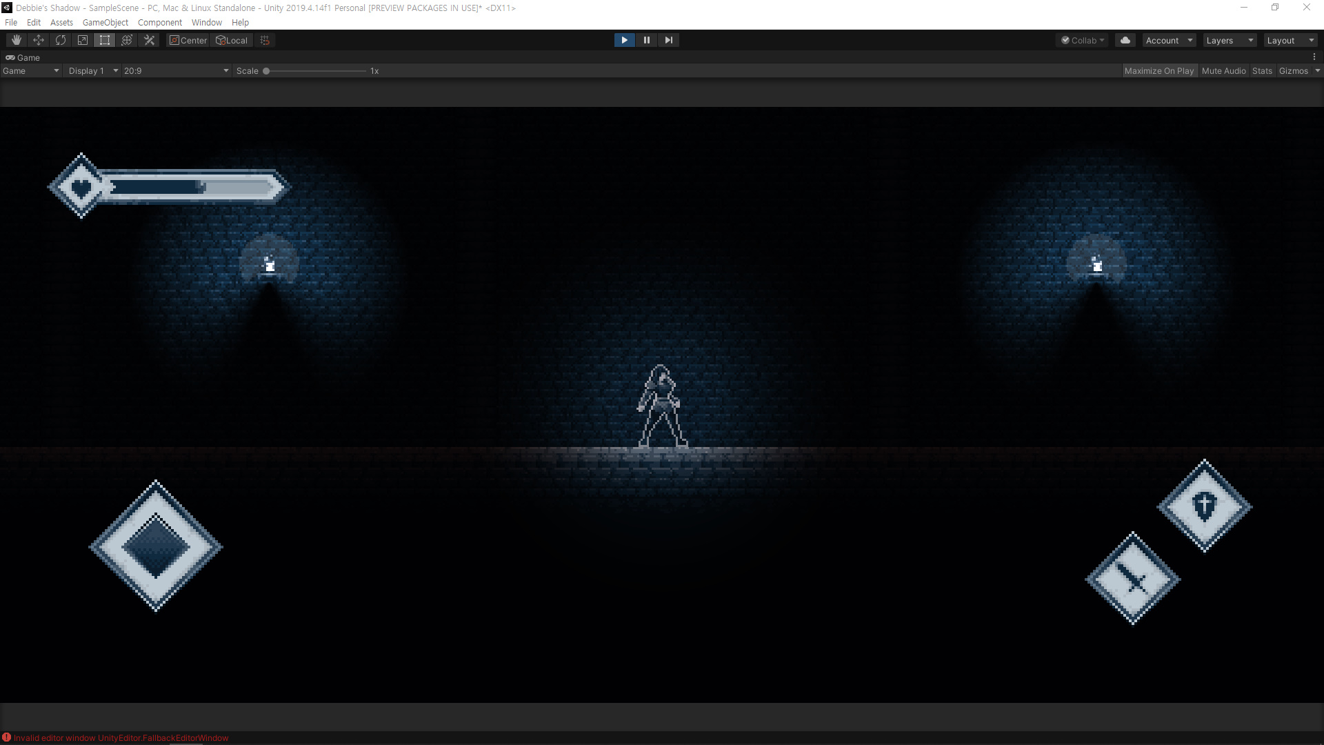 이동을 위한 조이스틱과 공격, 방어 버튼, 그리고 HP바가 추가되었습니다.