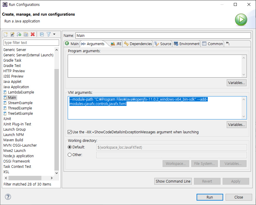 JavaFX 프로젝트의 Main클래스를 찾아 Arguments의 VM arguments에 다음과 같이 적는다.
