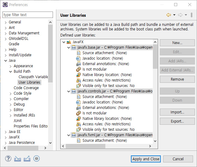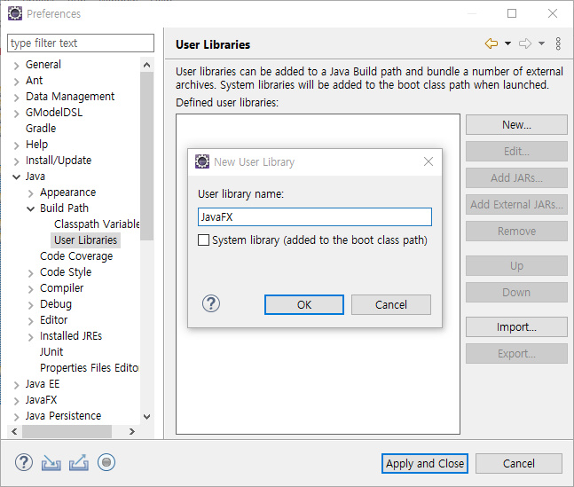 먼저 이클립스 상단 Window - Preferences - Java - Build Path - User Libraries 로 들어가 New를 누르고 이름을 JavaFX로 짓는다.