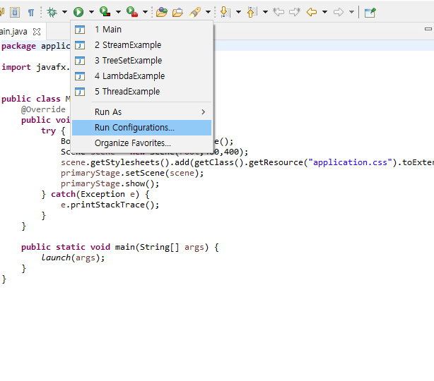 6. 위쪽 상단의 실행 버튼 옆 화살표를 눌러 Run Configurations를 연다.