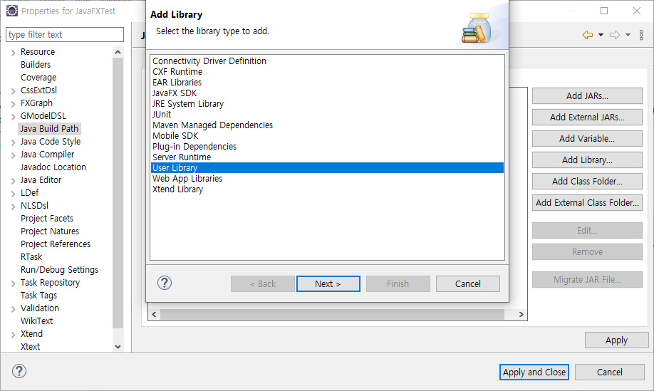 JavaFX 프로젝트를 우클릭해 나온 창에서 Properties - Java Build Path - Libraries - add Library - User Library - 방금 만든 JavaFX 라이브러리를 추가해 준다.