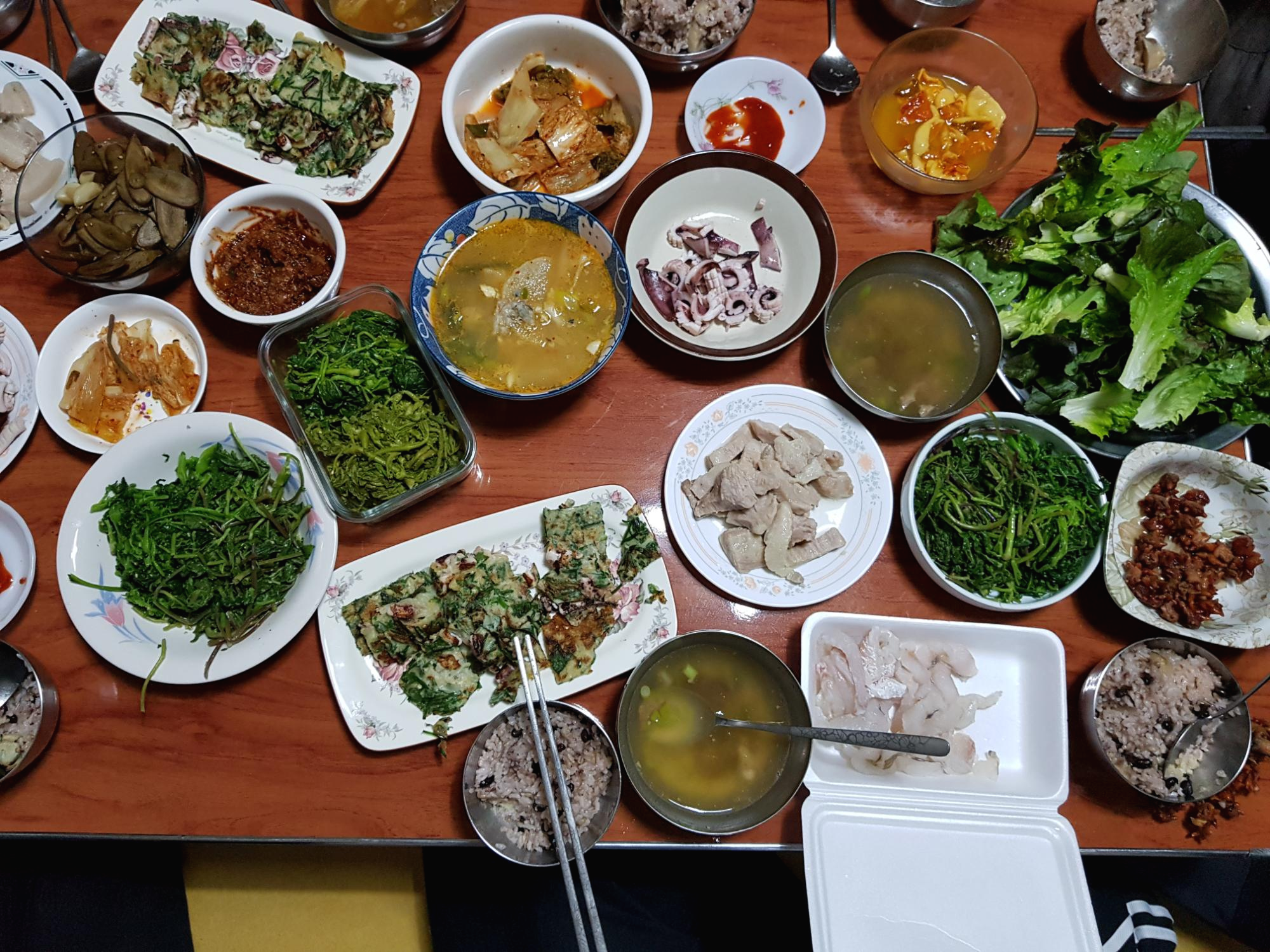 우리 왔다고 할머니랑 마침 와있던 이모가 상다리가 부러지게 상을 차려주셨다.