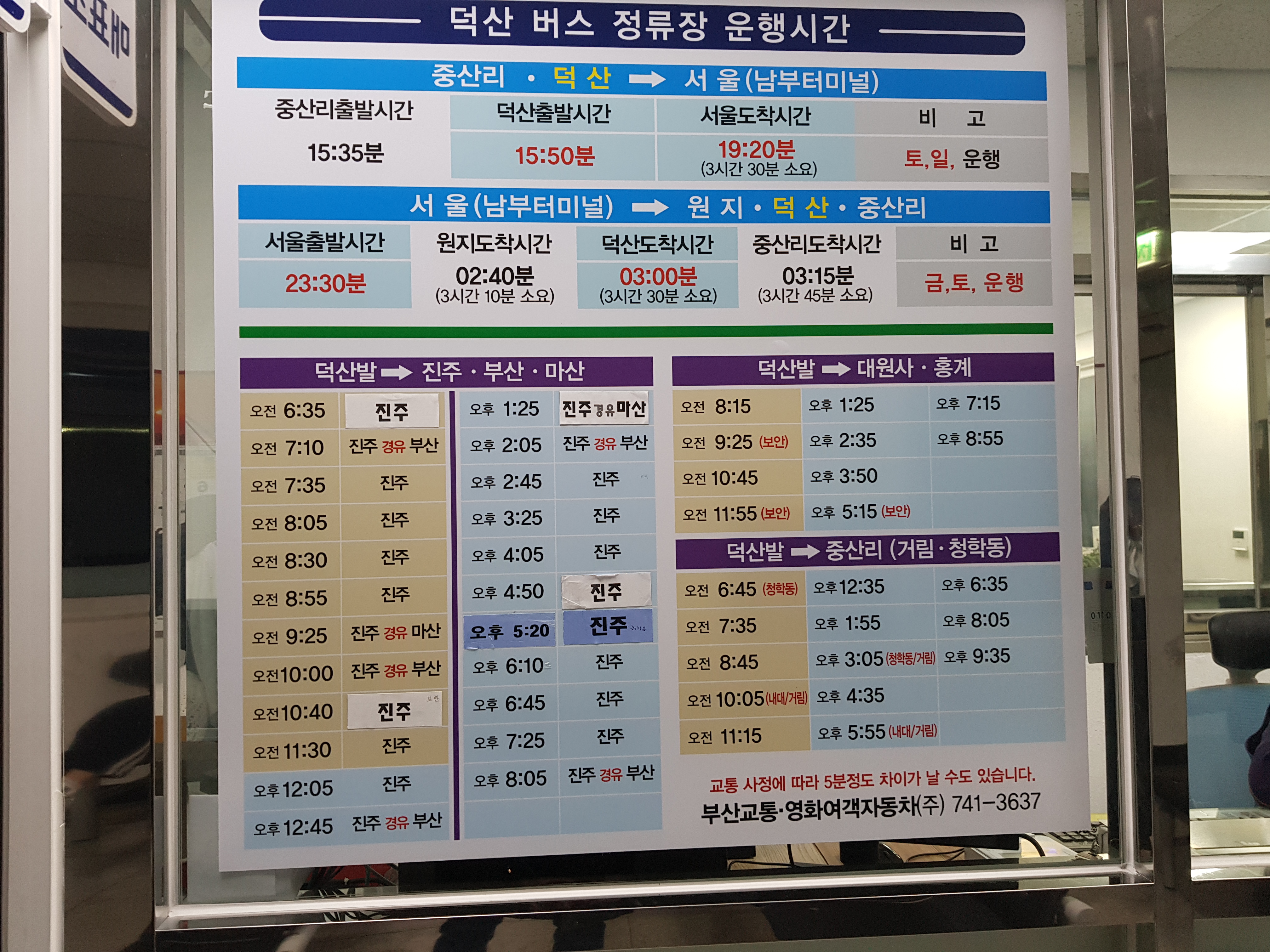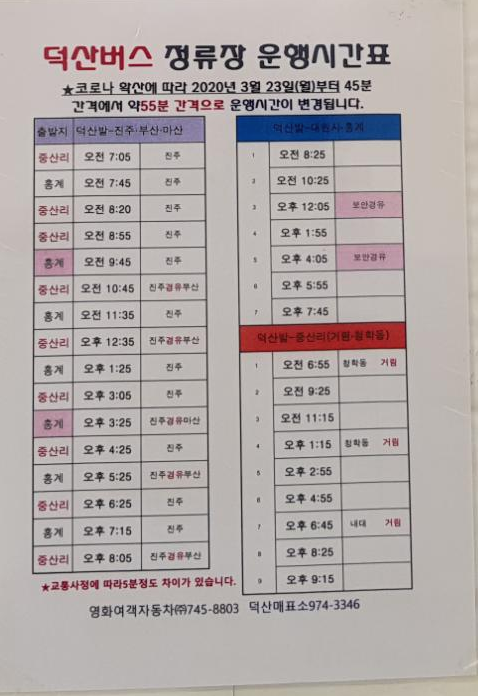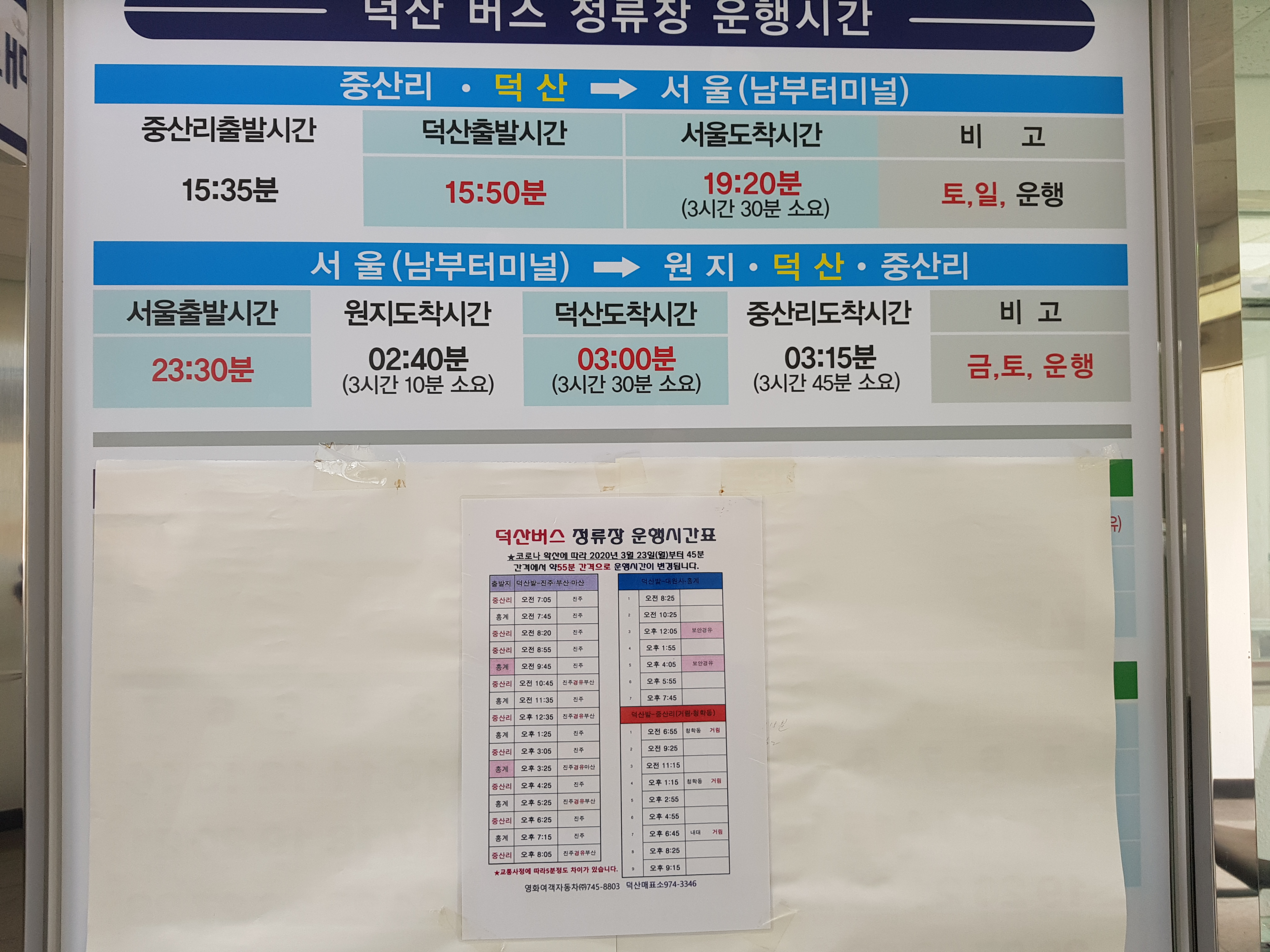 한 장은 코로나 사태 터지기 전의 시간표고, 나머지 한 장은 코로나 사태로 변경된 운행 시간표입니다.