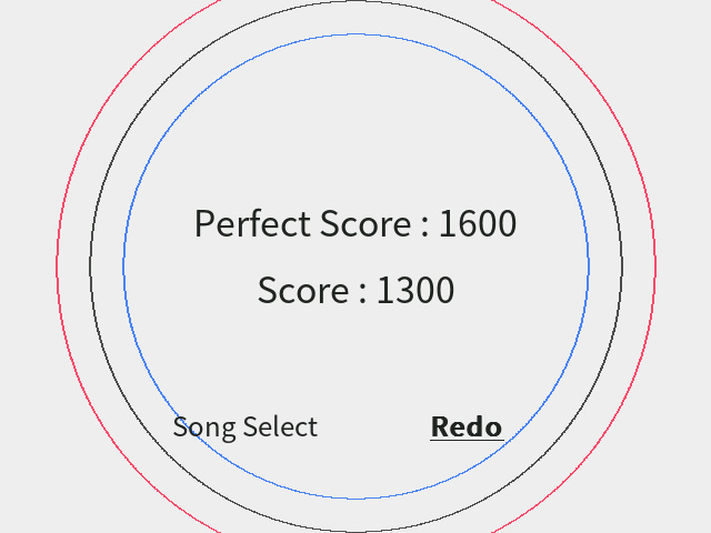 게임이 끝나면 점수와 퍼펙트 점수를 보여줍니다. 퍼펙트 점수는 해당 곡에서 얻을 수 있는 최고 점수입니다! 최고점수에 도달하면 곡 선택창에서 해당 곡에 '퍼펙트 클리어!' 라는 글자가 생깁니다.